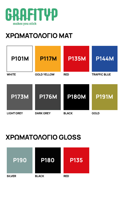 Στη φωτογραφία εμφανίζονται οι διαθέσιμοι κωδικοί χρωμάτων σε Matt και Gloss φινίρισμα.